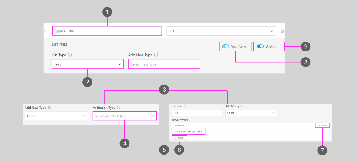 - Add new type functions to add a type to the type of list used. There are two types, namely input, and select. Selected new type will determine the list type and additional configuration settings.